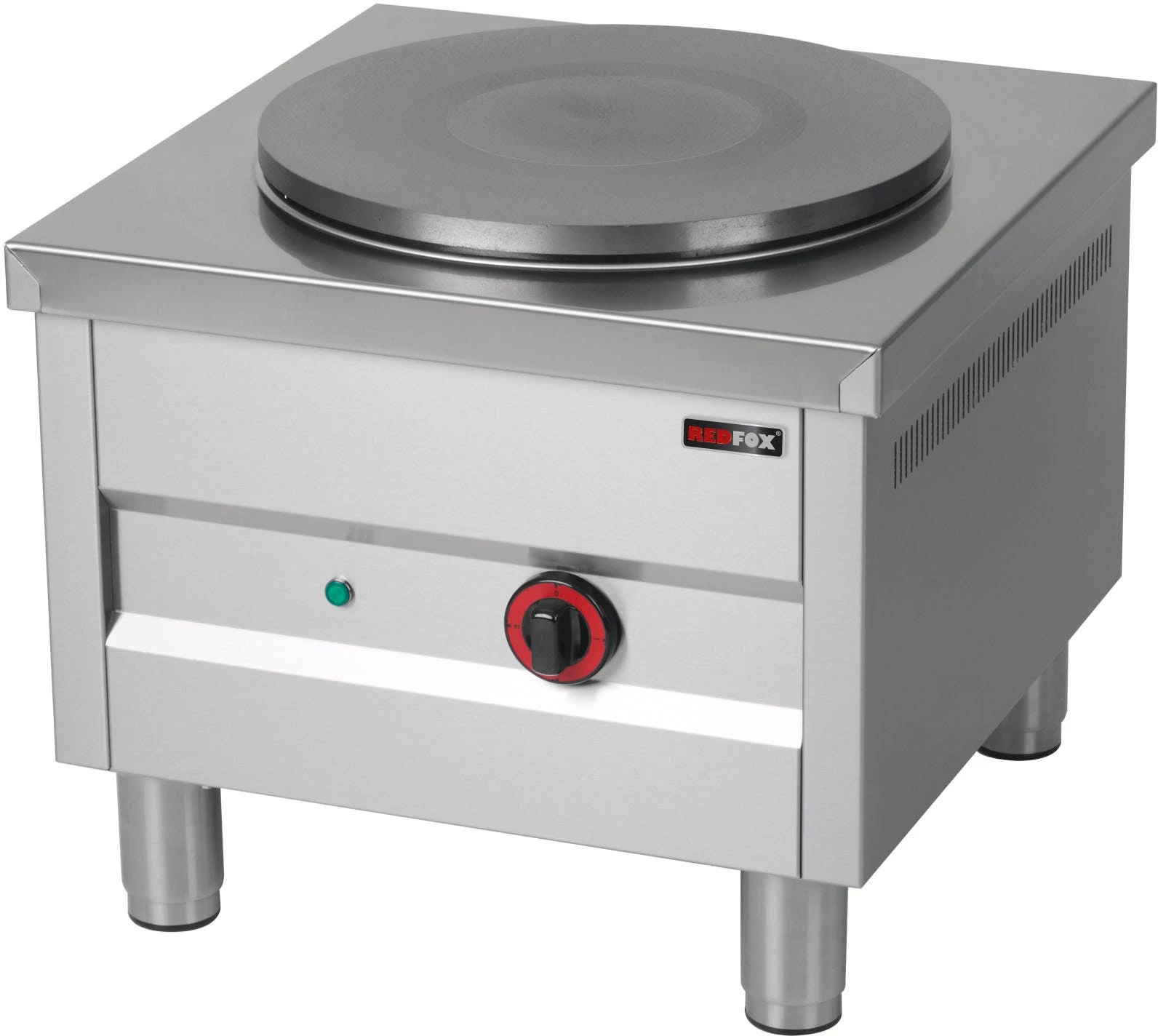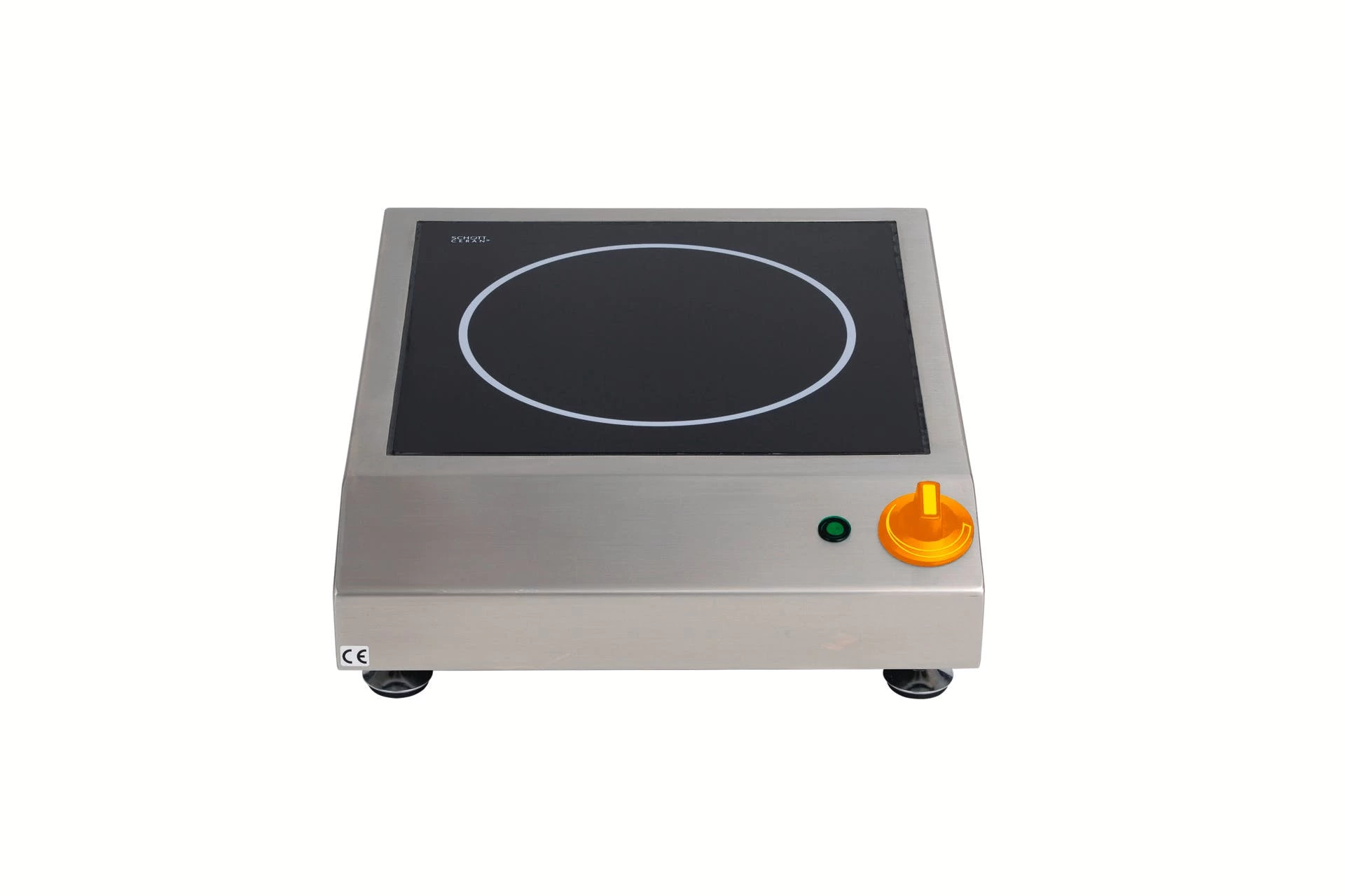 > Edelstahlkorpus > mit tiefgezogener Kochmulde > hochgezogene Kanten als Überlaufschutz > 6-stufiger Energieregler pro Kochstelle > 4 runde Platten mit je 2,00 kW, ø 180 mm > Platten mit Überhitzungsschutz