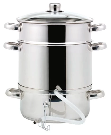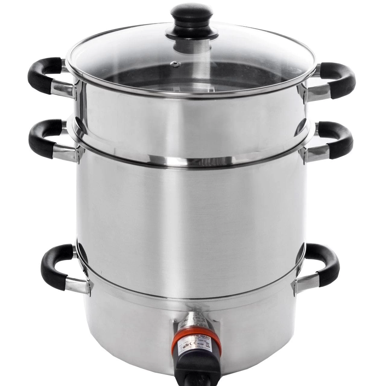 Mobiler Dampfentsafter Dampfgarer aus Edelstahl mit HeizelementDieses Gerät von Syntrox Germany vereint die Funktionen Dampfgaren und Entsaften. Der Dampfentsafter macht es möglich, die besten eigenen Saftkreationen zu erzeugen. Durch das Dampfentsaften wird der Saft nur erhitzt, aber nicht gekocht. Dadurch bleiben wertvolle Inhaltsstoffe wie Fruchtzucker, Fruchtsäure und Vitamine ebenso wie Aroma, Farbe und Geschmack erhalten. Sie geben die Früchte mit soviel Zucker wie sie es mögen in den Behälter und erhalten gesunde Säfte, Fruchtgelee oder Kompott. Außer Obst lassen sich auch verschiedene Gemüsesorten sowie Kräuter zu Saft verarbeiten. Der Entsafter besitzt einen Ablaufschlauch mit Schlauchklemme, um das Abfüllen in die Flaschen zu erleichtern. Dank des eigenständigen 1500 W starken elektrischen Heizelements kann das Gerät auch direkt im eigenen Garten verwendet werden, gleich nachdem die Früchte geerntet worden. Eigenschaften: • Power: 1500W • 230-240V ~ 50Hz • Bedienungsanleitung de/en • Gewicht: ca. 3,2kg • Kapazität Wasserbehälter:3,5L • Kapazität Saftbehälter: 8,5L • Temperature von-bis in °C: 0-100 • Kabellänge: 130cm • Maße (L/T/H): 35x29x39cm