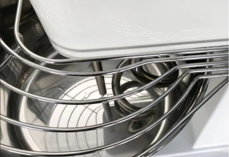 - Das Gefäß, die Spirale, der mittlere Teigbrecher und das Schutzgitter sind aus Edelstahl