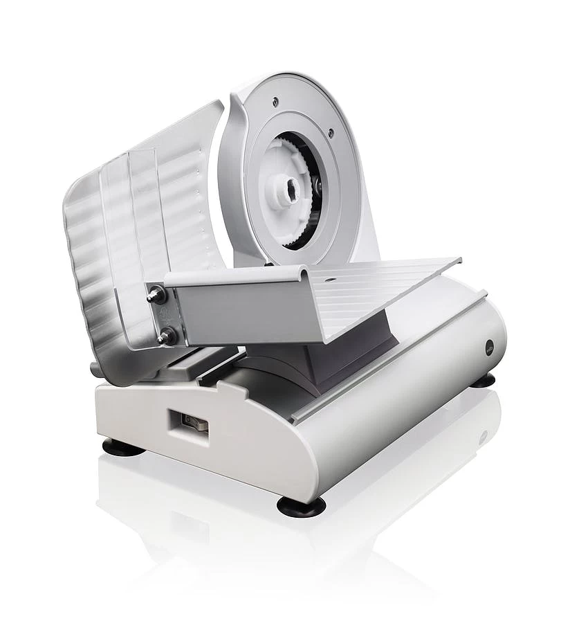Der scharfe Wilfa Allesschneider FS-200W verfügt über einen 200 Watt starken Motor, mit dem ohne Weiteres Lebensmittel wie Fleisch, Brot, Käse usw. in Scheiben geschnitten werden können. Die scharfe Universalklinge aus rostfreiem Edelstahl in deutscher Qualität hilft dabei, immer das bestmögliche Ergebnis zu erzielen. Sie schneidet Lebensmittel in kürzester Zeit und gleitet mühelos durch das gewünschte Produkt. Die Schnittstärke kann mit dem hochwertigen Allesschneider individuell zwischen 0-15 mm eingestellt werden. Das Gerät besitzt einen massiven Aluminiumkörper, mit abnehmbaren Teilen. Dadurch wird die Reinigung erleichtert und Lebensmittelreste können im Nullkomanichts entfernt werden. Der Allesschneider bietet genügend Sicherheit während der Anwendung. Mithilfe der rutschfesten Füße hat er einen festen Stand und außerdem werden die Finger mit dem zusätzlichen Fingerschutz abgesichert.